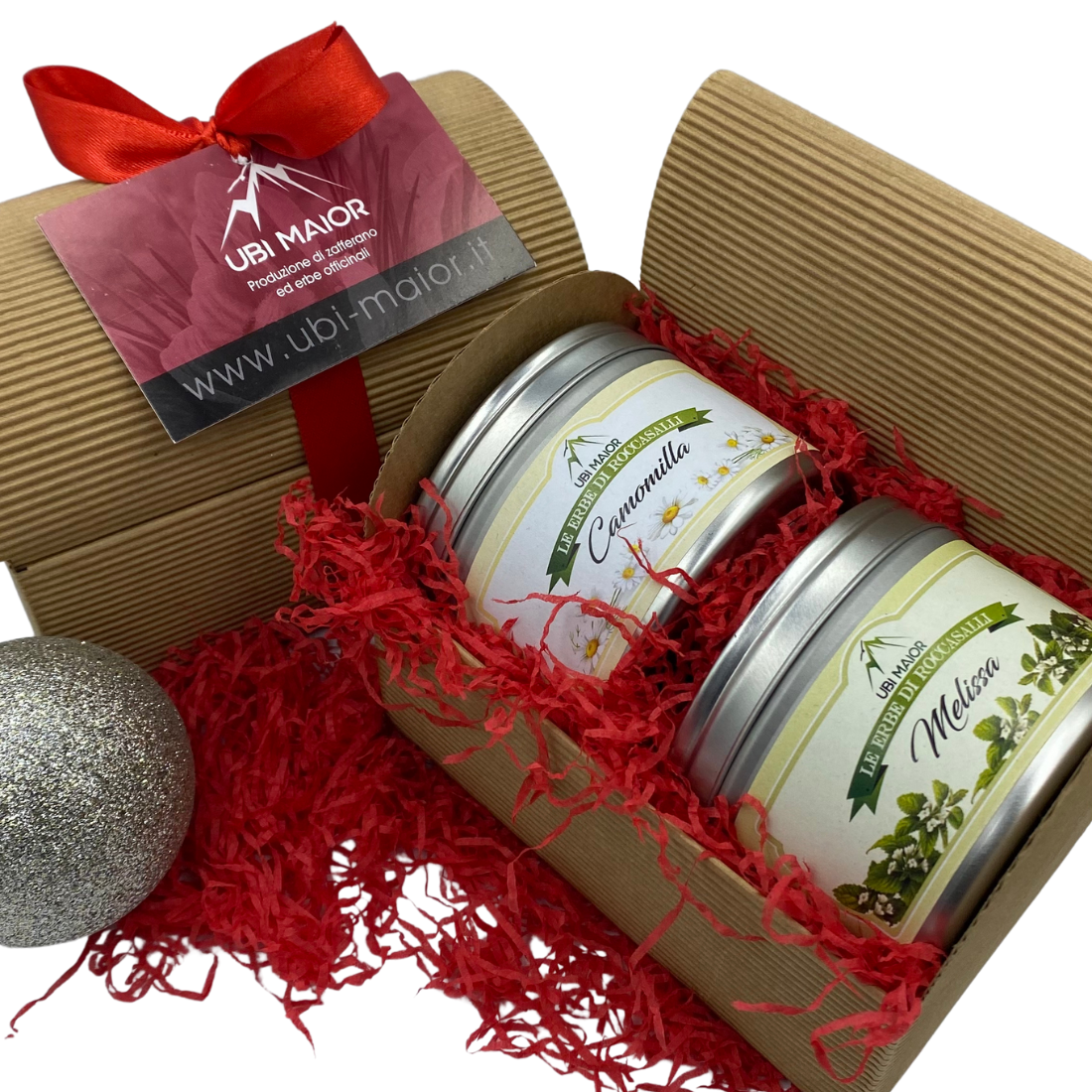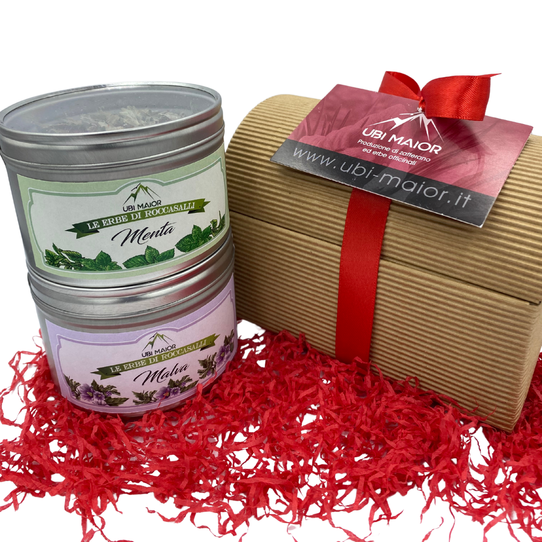 Crea il tuo momento di benessere con il nostro Cofanetto Duo Infusi, composto da due tisane a tua scelta tra Camomilla, Malva, Menta e Melissa.